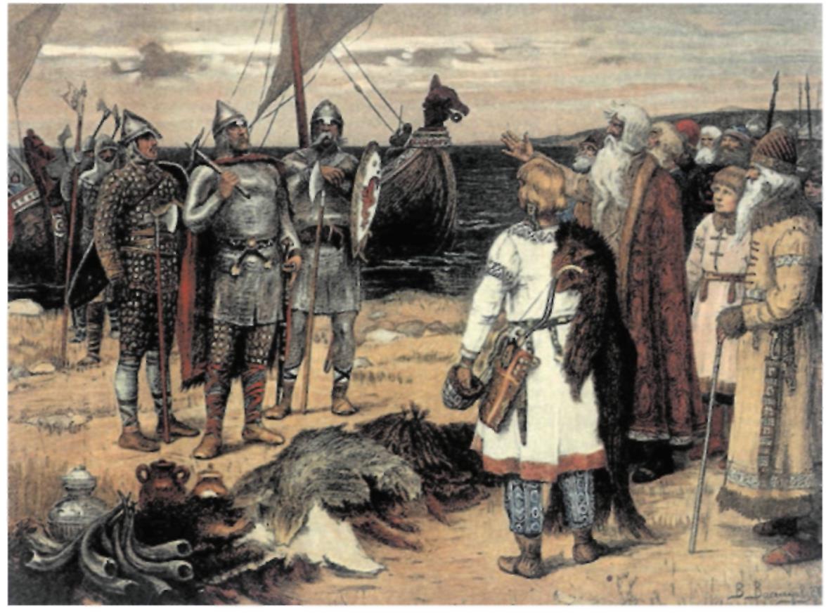 Легенда о призвании варягов. Как вы помните, варяги принудили кривичей и ильменских словен платить дань. В 862 г. славяне прогнали варягов за море и стали «сами собой владеть». Но началась межплеменная усобица. Чтобы прекратить ее, решили пригласить нейтрального иноземного владыку. Послы кривичей, словен, мери и чуди отправились к варягам с призывом: «Земля наша велика и обильна, а порядка в ней нет. Приходите княжить и владеть нами». Три брата – Рюрик, Трувор и Синеус – согласились. Рюрик сел в Ладоге, Синеус – на Белоозере, а Трувор – в Изборске. Через два года умерли Трувор и Синеус. Рюрик княжил во всей земле один. «Те варяги назывались русью… И от тех варяг прозвалась Русская земля».