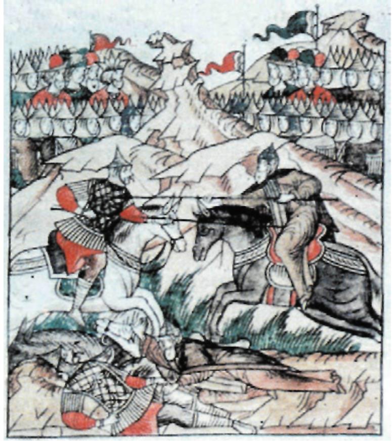 Поединок Пересвета с Челубеем. Миниатюра из «Сказания о Мамаевом побоище»