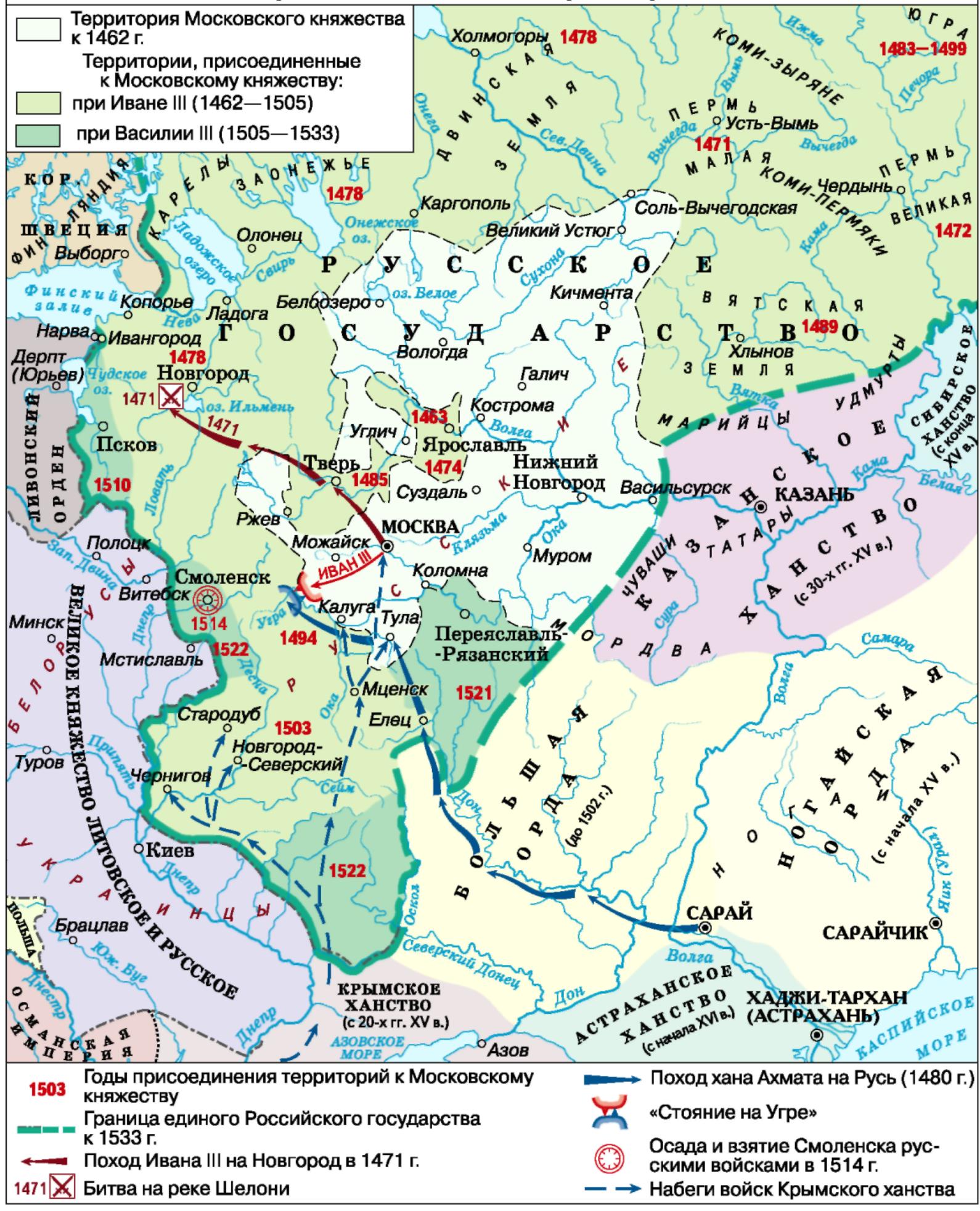 В правление сына Ивана III Василия III (1505 – 1533) расширение государства продолжалось. В его составе оказались Псков (1510), Смоленск (1514), Рязань (1521).
