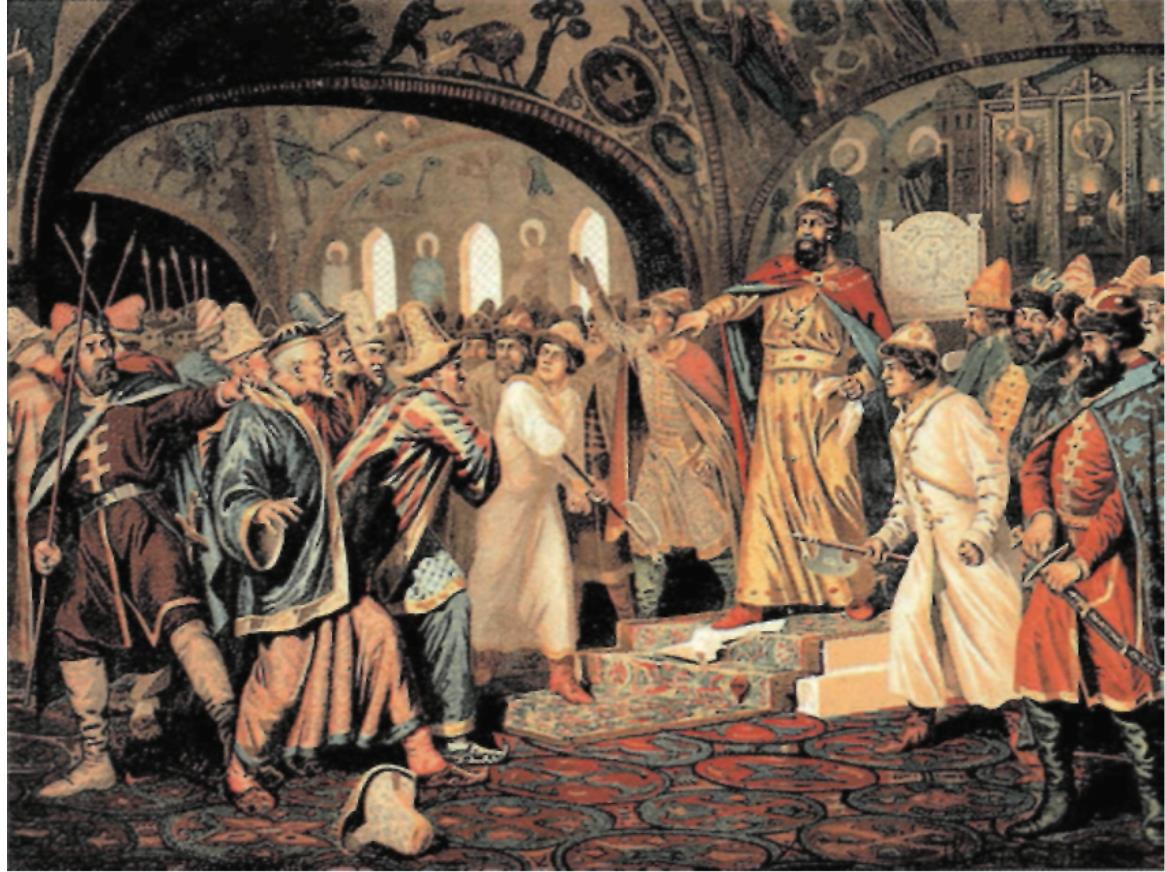 «Государь всея Руси». Главой Московского государства был великий князь, «государь всея Руси». (Иван III объявил своим соправителем сына от первого брака Ивана Молодого, однако этот решительный и умный князь умер раньше отца, в 1490 г.) Новый титул «государь» подчеркивал, что московский монарх возвышается над своими подданными (боярами, служилыми людьми, крестьянами и т. д.), как хозяин над холопами.