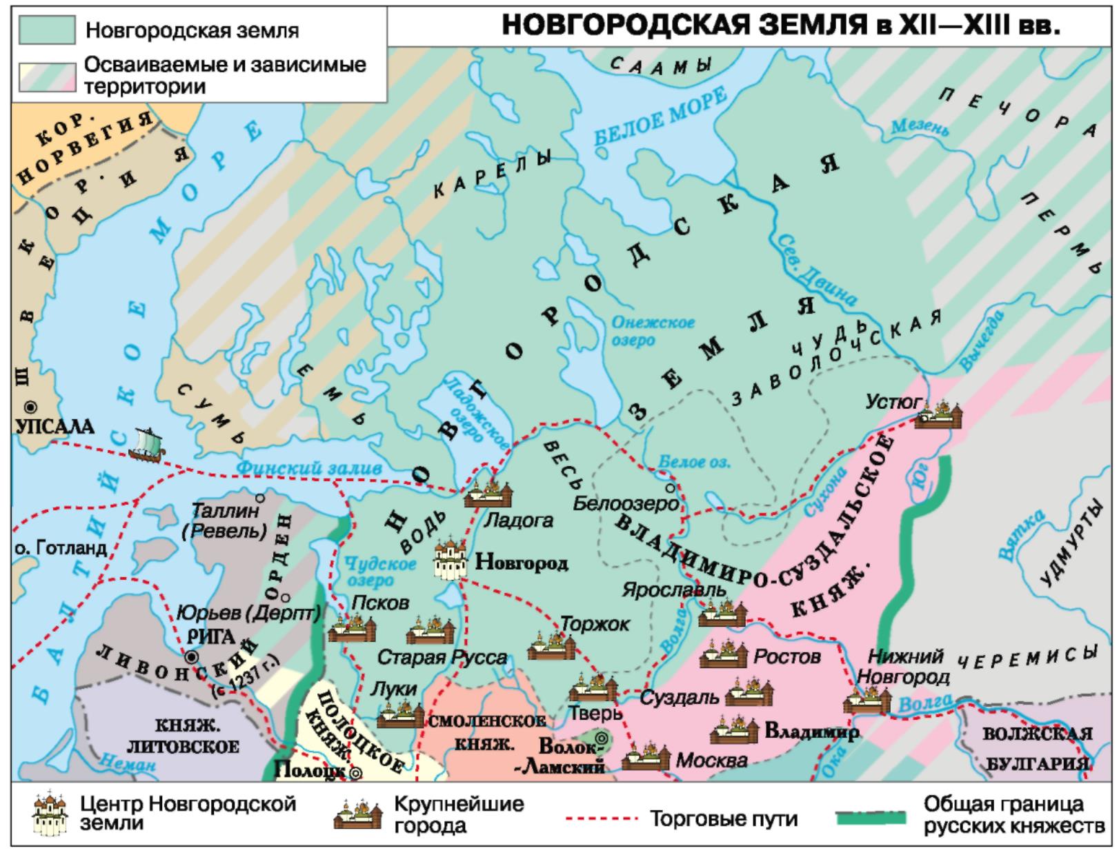 Утопавший в лесах Новгородский край отличался суровым климатом и бедными почвами. Плотность населения была низка, но новгородцы продолжали раздвигать границы страны. Вооруженные отряды новгородцев продвигались все дальше в поисках новых данников и промысловых угодий. В Карельском крае они соперничали со шведами, в Прибалтике проникли в земли эстов и литвы. По рекам эти удальцы плавали на узких лодках – ушкуях, за что с XIII в. стали называться ушкуйниками.