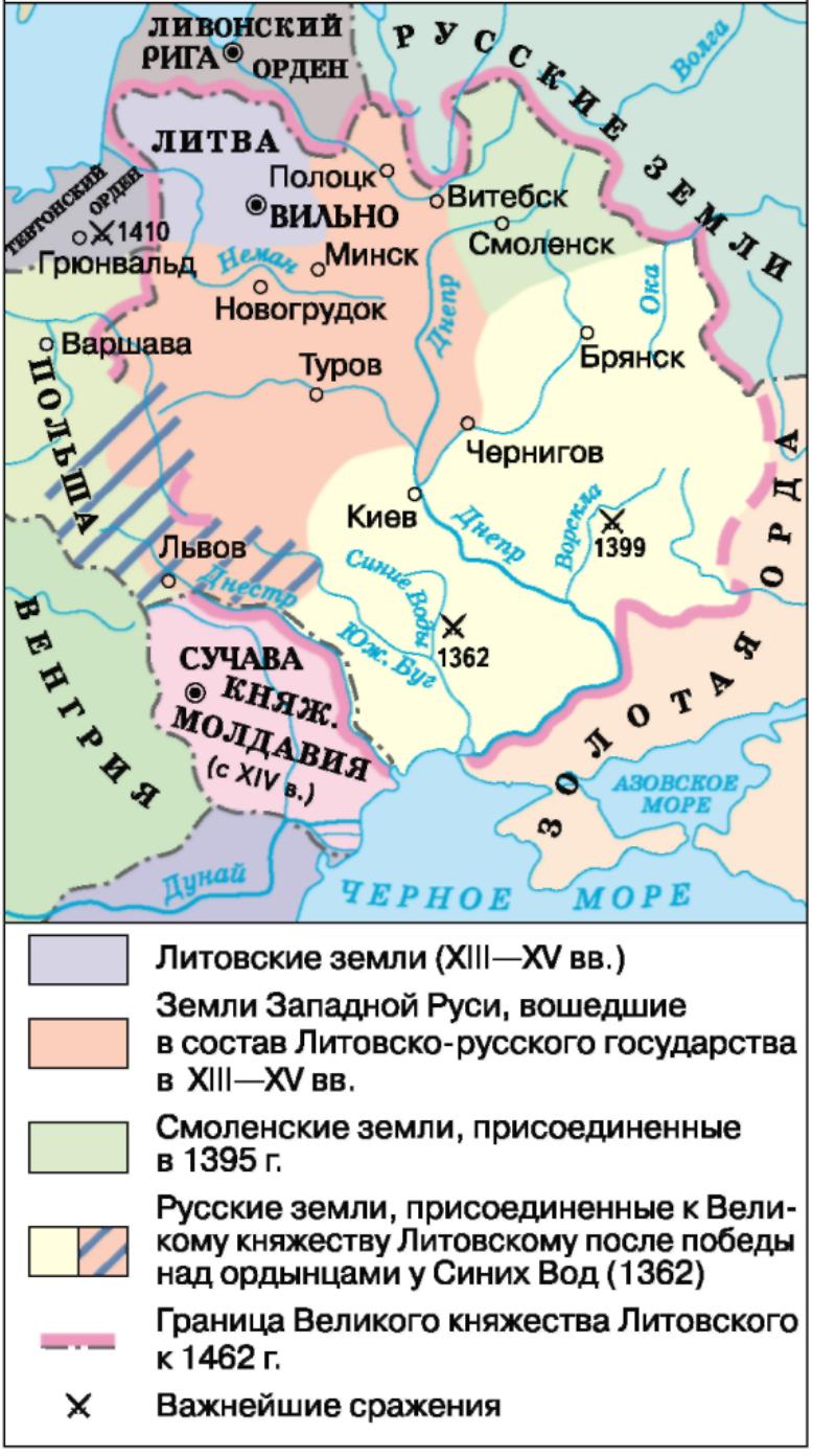 Ольгерд и Кейстут добились больших успехов. Все западнорусские земли уже входили в державу Гедиминовичей, а после разгрома Ольгердом ордынского войска в битве у Синих Вод (1362) от ордынского ига была освобождена Южная Русь (будущая Украина). Она вошла в состав княжества. Так 8 из 12 древнерусских земель, образовавшихся в XII в. на месте Древней Руси, в середине XIV в. были собраны под скипетром Ольгерда.