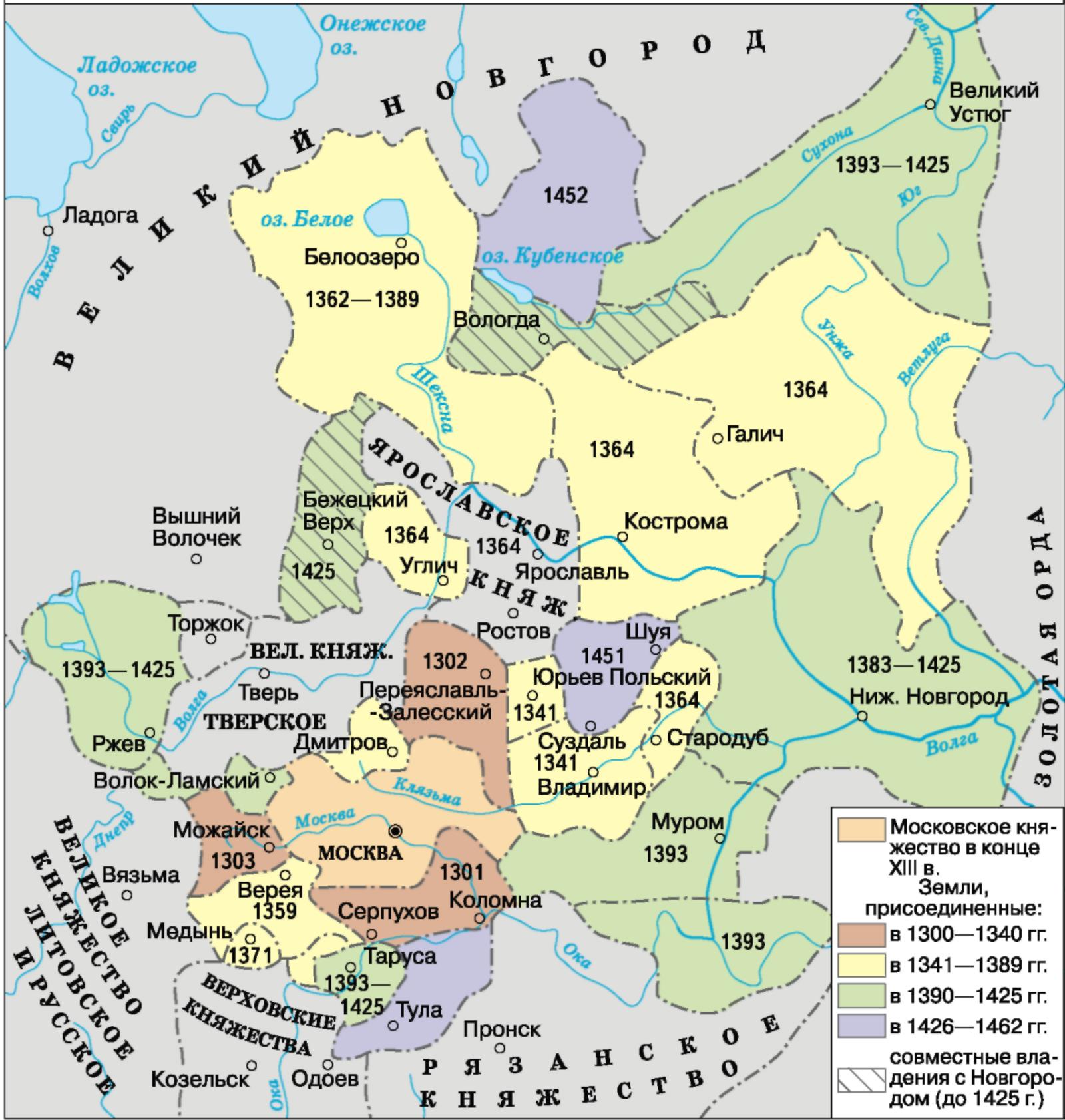 Предпосылки объединения. Спаленные дотла в Батыево нашествие и потом часто посещаемые баскаками и карательными ратями «старые» области Северо-Восточной Руси обезлюдели. Запустел стольный Владимир, древние Ростов и Суздаль. Их жители уходили на новые места. Младшие города (Переяславль-Залесский, Городец-на-Волге, Нижний Новгород, Тверь, Москва) росли. Густые леса в какой-то степени защищали их от врагов. Подле удельных городов появлялись боярские вотчины. Правда, боярам скоро становилось тесно в границах небольших княжеств, а покупать земли за пределами своего удела они не имели права. Это настраивало вотчинников в пользу объединения.