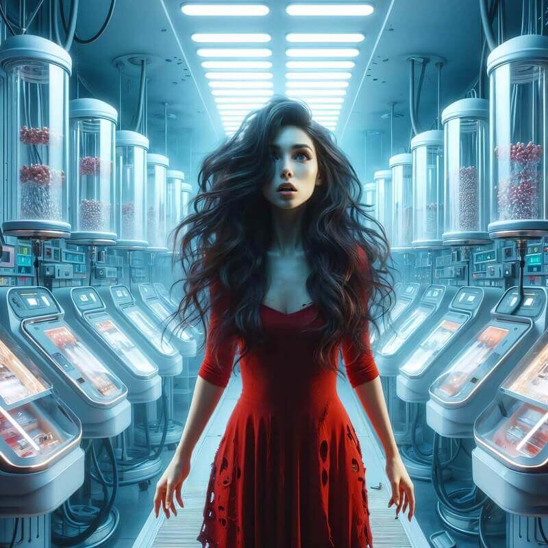 Моё алое платье всё ещё было на мне. Но. Я оказалась внутри колбы с прозрачной жидкостью. Почему-то удавалось дышать.