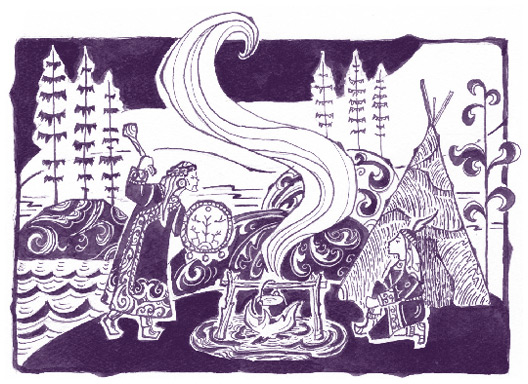 Переправился он через Амур, поставил на берегу шалаш, развел костер, стал варить кашу из пшена. Вдруг захлопали крылья, вылетела из кустов тальника большая птица, села на землю, превратилась в косматую старуху. В одной руке у нее бубен, в другой – колотушка.