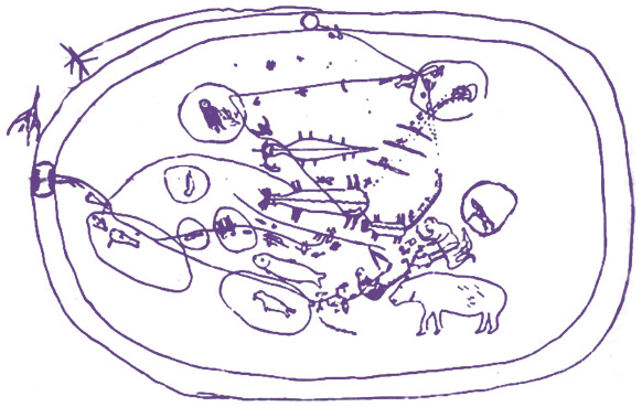 В 1929 году шаман Савелий Хутунк по просьбе участников этнографической экспедиции76 нарисовал подробную карту Вселенной, какой представлялась она орочам. Земля виделась им в образе гигантской восьминогой лосихи. Хребет животного – горная цепь из девяти вершин, которая делит землю на две части. К востоку от хребта живут орочи и родственные им народы, к западу – русские и все остальные. Шерсть лосихи – это леса, растущие на земле; блохи, живущие в ее шерсти, – лесные звери, а вьющиеся над ней комары и мошкара – птицы. Когда лосиха переступает с ноги на ногу, случаются землетрясения.