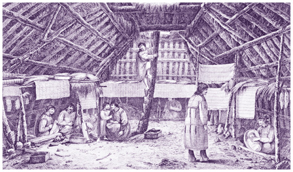 Женщин все это пугало, напряжение росло, и, когда оно достигало пика, на улице раздавался шум. Мужчины, посовещавшись, выбирали храбреца, который должен был узнать, что происходит. Но едва тот выходил из жилища, шум перерастал в страшный, угрожающий рев, слышались вопли, грохот, от которого тряслись стены. Мужчины, в ожидании нападения, вставали плечом к плечу, принимали воинственный вид и говорили, подбадривая друг друга: «Держись! Крепись! Не сдадимся!» И тут через дымовое отверстие42 в жилище проникало косматое чудище огромного роста: это был один из участников представления, одетый в особый костюм «травяной чучелы». Женщины тряслись от страха, кто-нибудь из мужчин громовым голосом приказывал погасить свет, и во тьме начиналось сражение. Топот, звуки ударов, вопли: «Бей их! Гони прочь!» Наконец становилось ясно, что хозяева одержали победу и преследуют незваных гостей с торжествующими криками.