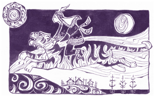 Привели тигры юношу в чистое поле, зажгли девять раз по девять огней. Тут содрогнулась земля, завыл ветер, налетел, как буря, злой дух-великан. Бросились на него тигры, вцепились когтями и зубами. Но великан рассыпался на девятерых братьев-близнецов, рожденных в один день одной матерью. Окружили они тигров со всех сторон, стали колоть их острыми копьями.