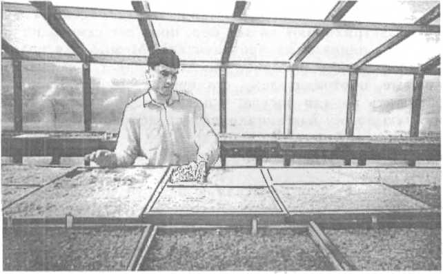 Емкость стандартного рассадного ящика – 12 л. В рассаднике, где одновременно устанавливается до 200 ящиков (раздел 3.1.3), только для однократного их заполнения требуется 2,5 куб. м почвосмеси – более 0,6 куб. м песка и около 2 куб. м опилок. Для смешивания больших количеств опилок и песка вблизи рассадника выделяют площадку, которую бетонируют или асфальтируют. Если есть необходимость, то опилки предварительно просеивают сквозь грохот для удаления стружек и обрезков дерева. Песок часто тоже требует просеивания – для удаления камней. Опилки и песок смешивают на асфальтированной площадке, добавляя на каждые 3 лопаты опилок 1 лопату песка (или на каждые 3 ведра опилок 1 ведро песка). Компоненты тщательно перелопачивают и разносят по ящикам.