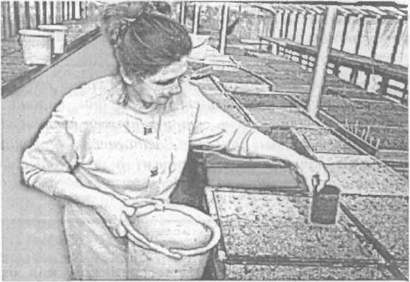 В каждый рядок стандартного ящика высевают от 50 до 120 средних семян и до 200-250 мелких (табл.12). Семена равномерно распределяют как по длине, так и по всей ширине бороздки.
