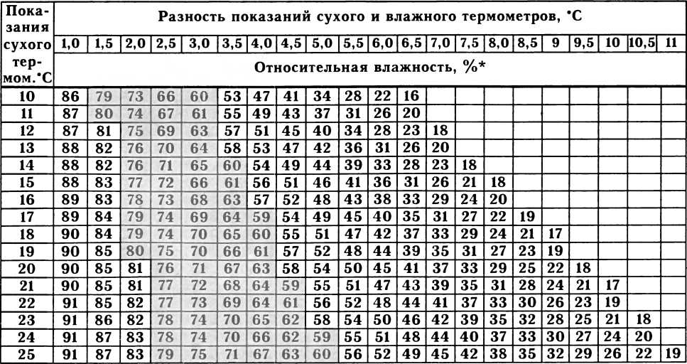 • Из первой цифры вычтите вторую и по разности показаний сухого и влажного термометра определите по таблице 25 относительную влажность.