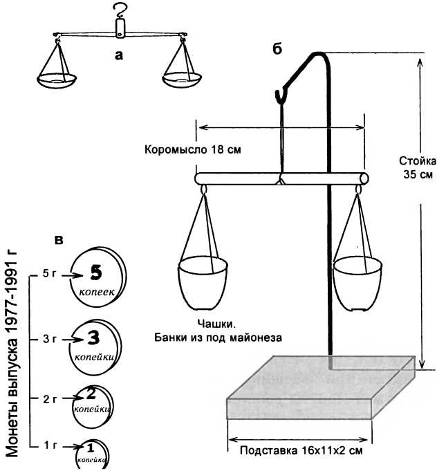 Самое главное для точности взвешивания, чтобы коромысло было подвешено строго посередине, а чашечки – на равном расстоянии от концов коромысла. Места подвески размечают на карандаше, а потом на отмеченных местах делают неглубокие выемки, чтобы нитки с них не съезжали. Каждую чашечку подвешивают на 3 нитях, при этом важно, чтобы все нитки были одинаковой длины и крепились на баночках на равном расстоянии друг от друга. Подвесить такие весы, также как и аптекарские, можно на любом крючке, однако работать на них удобнее, если они снабжены подставкой (отрезок полудюймовой доски) с укрепленной в ней стойкой–крючком, на который вешают коромысло (рис.5.14, б). Показанные на рисунке весы позволяют достаточно точно взвешивать вещества в диапазоне от 1 г до 200 г, и они более удобные в эксплуатации, чем аптекарские.