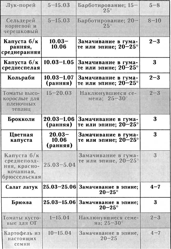 Некоторые холодостойкие овощи имеют особо длительный период вегетации: лук порей, лук репчатый (при получении репки из семян), белокочанная среднепоздняя, поздняя, краснокочанная и брюссельская капусты (в таблице 34 они показаны слабым затенением). По срокам посева семян (конец марта – начало апреля) все они являются претендентами на наши подоконники.