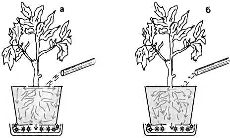 Рис. 7.2. Поведение воды при поливе пересушенного грунта (а) и сырого грунта (б): при пересушке земли поливная вода уходит, не смочив корневого кома