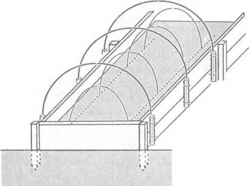 Внутреннее полосное укрытие. Внутреннее укрытие располагают по середине наружного от торца до торца. Когда на внутренней полосе используют насыпной грунт, внутреннюю полосу отделяют двумя стенками, сооружая «ящик в ящике». В остальных случаях внутренняя рамка не является обязательной, и дуги можно просто воткнуть в грунт. Поверху дуги скрепляют шпагатом, который закрепляют на торцовых стенках наружной рамы. Легкое укрывное полотно закрепляют на внутренних дугах как описано в разделе 8.2.4.