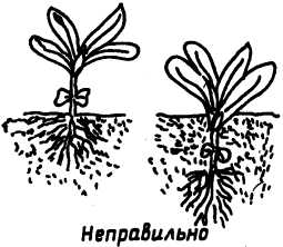 5. Важно посадить рассаду на нужную глубину. Большинство овощей надо сажать так, чтобы в лунку поместился не только корневой ком, но и нижняя часть стебля до настоящих листьев (рис. 5). Но нельзя засыпать землей точку роста – такая опасность существует, например, при пересадке капусты и свеклы.