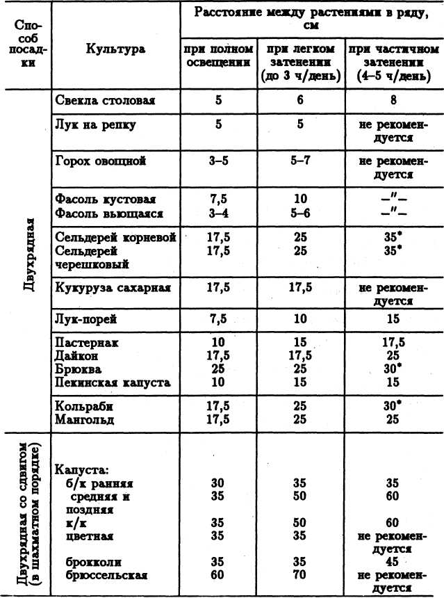 Как и при посеве семян, рассаду располагают в два ряда вдоль бортиков. В зависимости от величины растений рассаду высаживают напротив друг друга или со сдвигом (в шахматном порядке). Только самые крупные культуры располагают в один ряд, но не посередине гряды, а вдоль одного из бортиков. Для каждого вида овощных культур существует свое оптимальное расстояние между растениями в ряду (табл. 6). Более редкая и особенно более частая посадки приводят к снижению урожая с единицы площади гряды. Точно соблюдайте расстояния, указанные в табл. 6.