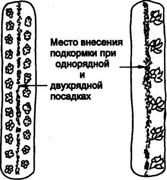 При подкормках сухие удобрения насыпают узкой полосой посередине гряды между двумя рядами растений (рис. 6), и затем гряды поливают до полного растворения удобрений. Если вы правильно подготовили гряды и их поверхность горизонтальна, то все растения при таком способе подкормки получат одинаковое количество питательных веществ и будут развиваться равномерно.
