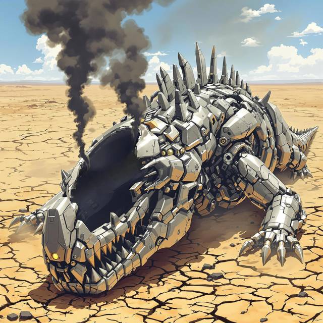 Сегменты рассыпались по полю боя, как звенья разорванного ожерелья. Многие из гибких бронепластин были деформированы, смяты или вовсе сорваны взрывами, обнажая сложные сочленения. Гидравлическая жидкость просачивалась из разорванных магистралей, окрашивая пыль в маслянисто-чёрный цвет.