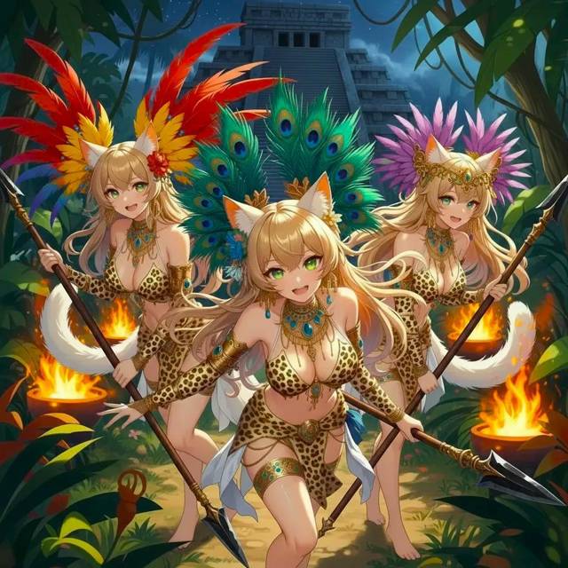 Одежда на них была, скажем так, минималистичной. Искусно выделанные шкуры каких-то пятнистых зверей, едва прикрывающие самые стратегически важные места. В руках они держали длинные, тонкие копья с обсидиановыми наконечниками.