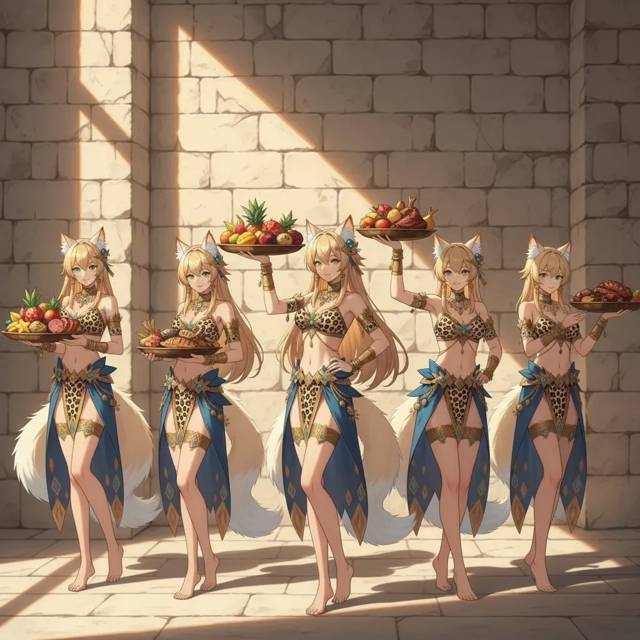 В дверях показалась процессия. Во главе торжественно шествовала верховная жрица, стуча посохом по каменным плитам. За ней, семеня и виляя хвостами, двигалась целая свита девушек. В руках они несли подносы, ломящиеся от снеди: сочные фрукты, запечённые рыбины размером с мою руку, дымящиеся куски мяса и пузатые глиняные кувшины, от которых за версту разило той самой кошачьей мятой.