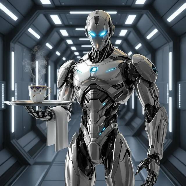 Из-за поворота, бесшумно ступая по палубе, появился наш робот-дворецкий. Он выглядел… безупречно. Его хромированный корпус сиял так, что в нём можно бриться, а на локтевом сгибе висело белоснежное полотенце. В руках он держал поднос с дымящейся фарфоровой чашкой. Увидев меня, робот замер на секунду, его оптические сенсоры мигнули синим.
