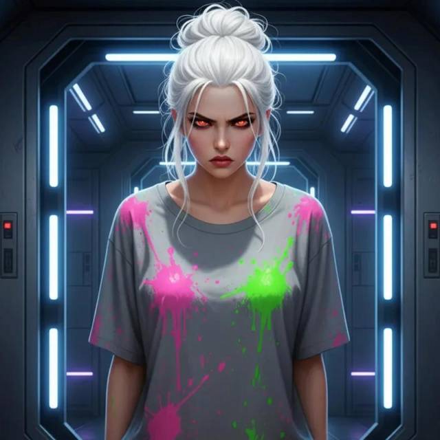 На ней была растянутая футболка с дурацким принтом какого-то мультяшного героя, вся перепачканная разноцветными пятнами краски. Её идеальные белые волосы были небрежно собраны в пучок, из которого выбилось несколько прядей. В рубиновых глазах плескалась не надменность, а вселенская усталость, знакомая всем родителям и воспитателям в детском саду.
