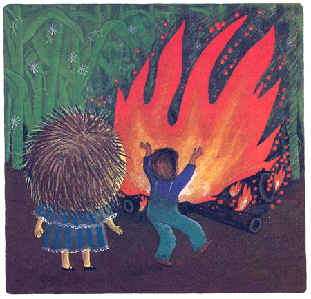 Малыш-орехоносик торжественно зажёг факелом костёр.