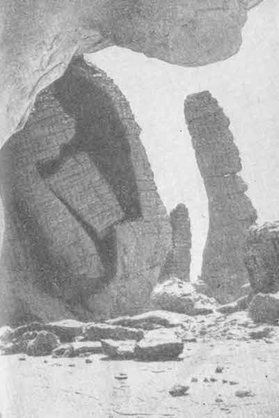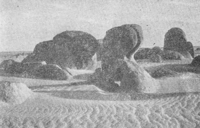 В мире безмолвия и смерти находки некогда живых свидетелей доисторических эпох особенно трогают за душу. На нас произвело большое впечатление, когда по ту сторону Бу-Ханифия, среди руин песчаниковых холмов и лежащих вокруг обломков камня мы впервые увидели окаменевшие стволы деревьев всевозможных размеров. Как и в некоторых других районах Сахары, здесь когда-то стоял лес, который вследствие перемещения земной коры опустился в море или вошел в соприкосновение с подземными водами; затем он был погребен под слоями песка и воды, окаменел, а позднее, снова поднявшись на поверхность, попал под воздействие ветра.