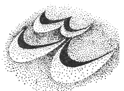 Самые мелкие песчаные наносы называются песчаной зыбью. Родственные образования возникают в случае, если вода течет по песку. В пустыне песчаная зыбь создает причудливую сеть или решетку, как это бывает и с крупными песчаными образованиями, с запутанным строением поверхности которых мы познакомились лишь после того, как на службу исследователю дюн пришла аэрофотосъемка. Сейчас мы знаем, что в отличие от многих других пустынь, где наиболее распространенной формой дюн являются поперечные серпообразные барханы, дюны Сахары – это длинные и прямые валы, между которыми часто остаются открытые для ветров долины очень большой длины. Естественно, возникновение известных нам форм дюн нельзя объяснить только горизонтальными перемещениями воздуха. Для объяснения возникновения сети дюн Маджабат-эль-Кубра, образующих правильные клетки, или «мастодонтов» среди дюн – огромных песчаных пирамид Южного Алжира – должны быть привлечены и другие факторы, такие, как анабатические ветры и электрическое напряжение, возникающее между отдельными песчинками.