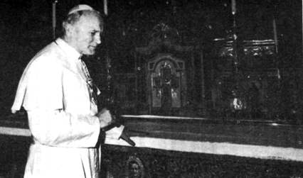 Иоанн-Павел II перед алтарем, за которым находятся почитаемые останки Святого Джованни Боско