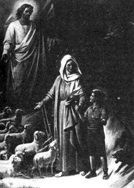 Посмотрев опять, я увидел вместо строптивых зверей кротких ягнят, радостно скачущих и блеющих, как бы в честь Синьора и Синьоры. В тот момент, по мере продолжения сна, я начал плакать, прося Женщину говорить со мной более понятно, так как не мог понять значения ее слов. Тогда, положив руку на мою голову, Она сказала: