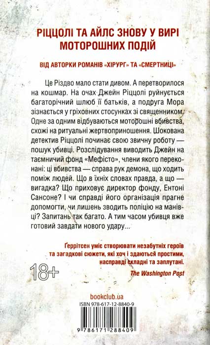 Це Різдво мало стати дивом. А перетворилося на кошмар. На очах Джейн Ріццолі руйнується багаторічний шлюб її батьків, а подруга Мора зізнається у гріховних стосунках зі священником. Одне за одним відбуваються моторошні вбивства, схожі на ритуальні жертвоприношення. Шокована детектив Ріццолі починає свою звичну роботу – пошук убивці. Розслідування виводить Джейн на таємничий фонд «Мефісто», члени якого переконані: ці вбивства – справа рук демона, що ходить поміж людей. Що в їхніх словах правда, а що – вигадка? Що приховує директор фонду, Ентоні Сансоне? І чи справді його організація прагне допомогти, чи лишень зводить поліцію на манівці? Запитань так багато. А тим часом убивця вже готовий завдати нового удару...
