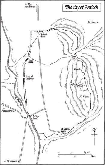 Even so, when the crusaders marched up to the city’s walls in late October they were daunted by the sheer scale of its defences. One Frank wrote in a letter to Europe that at first sight the city seemed ‘fortified with incredible strength and almost impregnable’. Antioch lay nestled between the Orontes River and the foot of two mountains–Staurin and Silpius. In the sixth century the Romans enhanced these natural features with a circle of some sixty towers joined by a massive enclosing wall–three miles long and up to sixty feet in height–running along the banks of the Orontes, and then up and across Staurin and up Silpius’ precipitous slopes. Hundreds of feet above the city proper, near the peak of Mount Silpius, a formidable citadel crowned Antioch’s fortifications. By the late eleventh century this defensive system had been weathered by time and ravaged by earthquakes, but it still presented an awesome obstacle to any attacking force. Indeed, a Frankish eyewitness was prompted to write that the city would ‘dread neither the attack of machine nor the assault of man even if all mankind gathered to besiege it’.21
