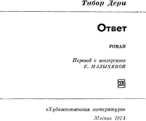 Т. Дери (р. 1894) – автор романов, рассказов, пьес, широко известных не только в Венгрии, но и за ее рубежами. Роман «Ответ» был написан в 1950—1952 гг. В центре повествования – судьбы рабочего паренька Балинта Кёпе и профессора Будапештского университета Зенона Фаркаша; действие происходит в Венгрии конца 20-х – начала 30-х годов со всеми ее тревогами и заботами, с надвигающейся фашизацией, с измученным безработицей, но мужественным, вновь и вновь подымающимся на борьбу рабочим классом.
