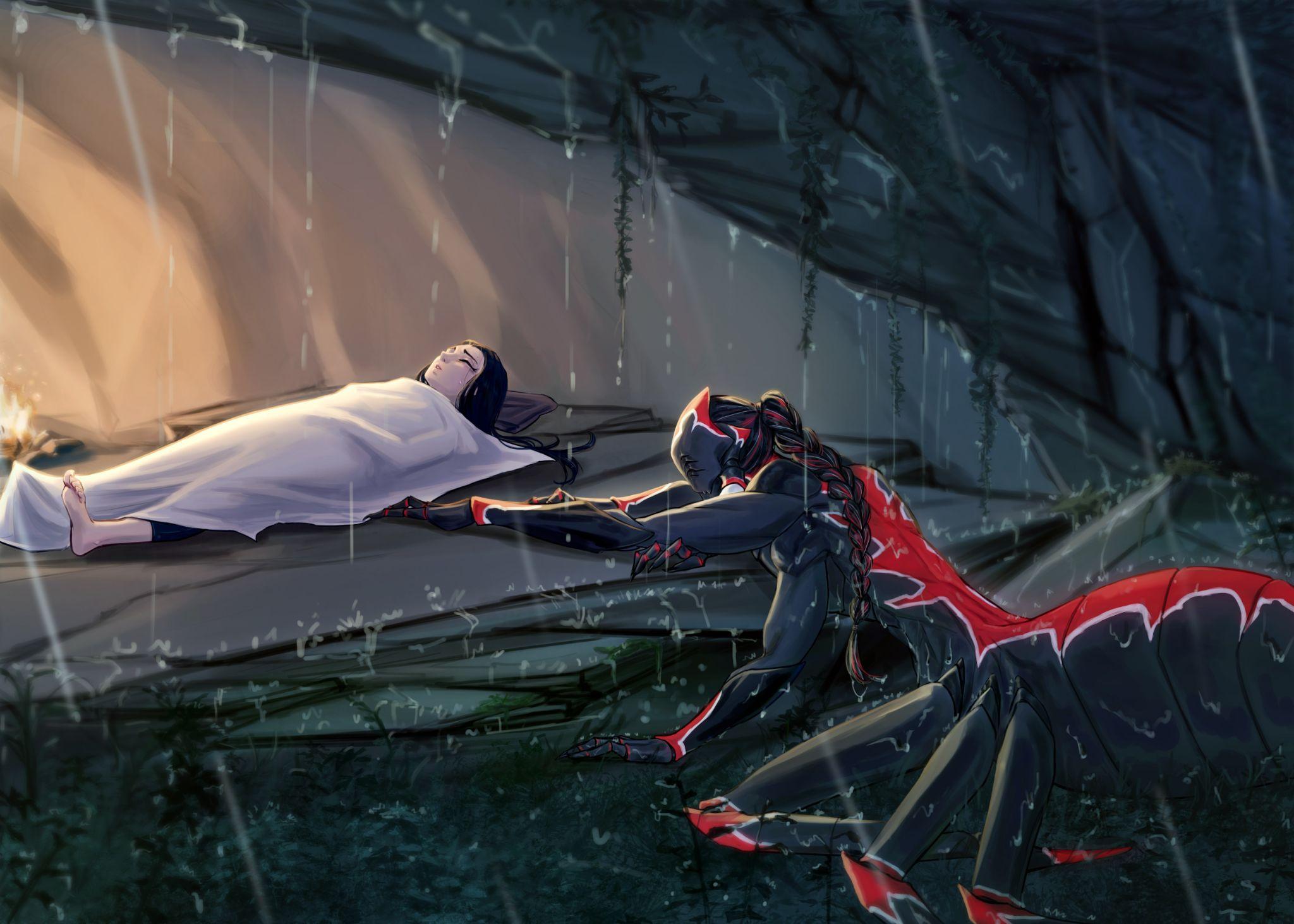 Она закрыла глаза, когда ее голова упала вперед, прижавшись головным гребнем к голове Кетана. Ее передние ноги прижались к внешней стороне его ног, широкие плечи сотрясались от прерывистого дыхания, а заунывный дождь продолжал лить.