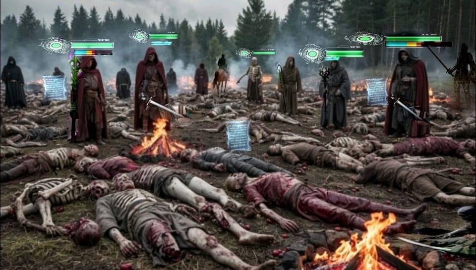 Скелеты сносили тела в одну кучу, и совсем скоро образовалась нехилая гора. Тем временем несколько некромагов чертили что-то своими посохами по земле. Любопытство охватило меня, и я решил остаться понаблюдать, что будет дальше.