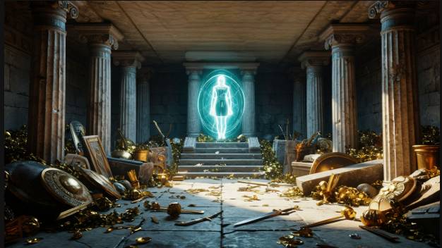 Получалось, я стоял на могиле Арес. Вдруг камень подо мной начал трескаться, и я успел в последний момент отскочить в сторону. Когда пыль осела, я увидел, что на метровой глубине лежит скелет, закованный в броню золотого цвета.