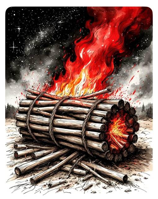 Шуметь непосредственно возле расположения врага нельзя. Так что – дров не нарубишь. Гномы по указанию Зобгина наломали руками толстых сучьев, он связал их в большую вязанку, для чего частично распустил свой свитер-исподнее. Связаны дрова были хитро, так, чтобы между ветками было пространство, для чего они были проложены поперечными ветками потоньше.