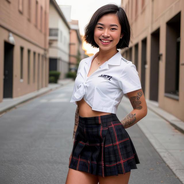 В это время из школы выбежала молодая девушка в белой рубашке и клетчатой юбке.