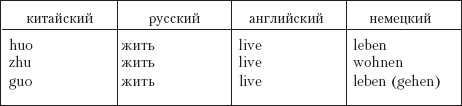 Различия, которые мы наблюдаем при сравнении китайского языка с русским, обнаруживаются и при сопоставлении с другими европейскими языками. В таблице приведены глаголы, выражающие соответствующие понятия в китайском и трех европейских языках.