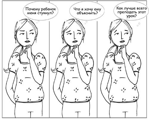 Ответы на каждый из трех вопросов зависят от индивидуальных особенностей ребенка, и приведенные нами варианты ответов даны для примера. Возможно, они подойдут не каждому ребенку и не в каждой ситуации. Мы лишь призываем вас по-новому взглянуть на приучение к дисциплине, изменить свои представления. Тогда при взаимодействии с ребенком вы всякий раз будете руководствоваться системным подходом, а не просто выпаливать первое, что пришло на ум, когда ребенок сделает что-то не то. Три вопроса – «Почему?», «Что?» и «Как?» – открывают нам путь от ситуативно-реактивных воспитательных мер к осознанным и чутким приемам целостного, рационально-эмоционального подхода.