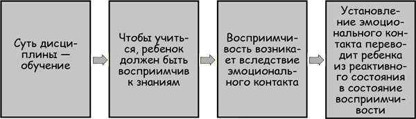 Итак, если ребенок взбешен, подавлен, пристыжен, растерян, переполнен эмоциями, так или иначе не владеет собой, мы особенно ему необходимы. Благодаря эмоциональному контакту мы можем успокоить его внутреннюю бурю и помочь сделать правильный выбор. Ощущая, что мы его любим и принимаем таким, каков он есть, чувствуя себя понятым – пусть даже нам не нравятся его поступки (или ему не нравятся наши), – ребенок мало-помалу обретет самоконтроль, и его высший мозг снова включится. Лишь тогда станет возможно поговорить о дисциплине. Иначе говоря, эмоциональный контакт с родителями выводит ребенка из реактивного состояния и делает восприимчивым к урокам, которые мы желаем ему преподать, и к полноценному взаимодействию, к которому мы стремимся.