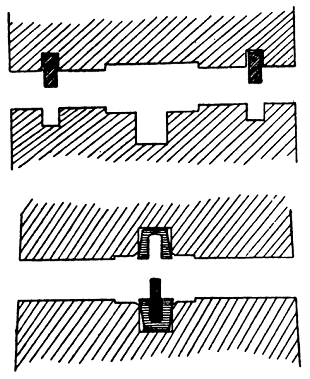 Рис. 20.Схема, иллюстрирующая виды соединения с помощью шипа и паза, применявшиеся в античном строительстве