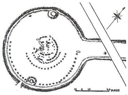 Оно состоит из широкого круглого рва, окружающего участок земли примерно 250 футов в диаметре, на котором находилось шесть грубых концентрических углублений, в которых когда-то стояли деревянные столбы (или стволы деревьев, по мнению Каннингтон) и размеры которых варьировали от 1 до 3 футов в диаметре. Деревянное сооружение подобного рода, конечно, не могло существовать долгое время и потому не соответствует первому требованию памятника, так что, как мне кажется, вряд ли оно было воздвигнуто над каким-либо захоронением; на самом деле, его внешний вид, если мы попытаемся восстановить его в воображении, говорит против такого предположения. Конечно, время от времени на этом месте могли проводиться погребения; сам участок, возможно, был даже освящен древней традицией прежнего пребывания здесь каменного круга, кургана или чего-нибудь в этом роде; но это еще вовсе не доказывает, что эти деревянные заросли представляли собой надгробный памятник. Неубедительно выглядят и все приводившиеся до сих пор аналогии. Поэтому, как мне кажется, единственным приемлемым объяснением является то, что Вудхендж был друидической рощей латенского периода.