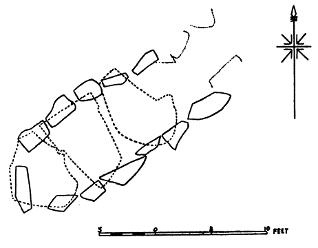 Это место (рис. 21), конечно, было знаменито начиная с бронзового века, т. е. с того времени, когда, как я предполагаю, возник храм в виде грубого круга из валунов песчаника или системы концентрических кругов, окруженных на некотором расстоянии рвом и валом; иными словами, в те времена здесь появилось скромное подражание гигантским кольцам Эвбери. Однако на протяжении бронзового века, вскоре после своего сооружения, эта конструкция претерпела видоизменения: добавился внешний круг примерно из 60 долеритовых камней, привезенных из гор Пресли в Пемброкшире. [218]218