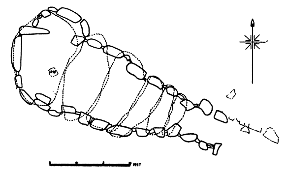 Памятник, о котором идет речь, известен под названием Ла Вард по холму, на котором он стоит, и представляет собой прекрасный образчик бутылкообразного галерейного захоронения (рис. 26). Его длина составляет примерно 40 футов, и его каменная облицовка практически не пострадала. Люкис обнаружил, что содержимое камеры распределяется в следующем порядке, начиная с земной поверхности и. продвигаясь в глубь: