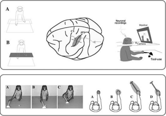 Возникает впечатление, что обезьяны так же способны инкорпорировать в свою телесную себя-модель визуальный образ собственной руки так, как он явлен на экране монитора компьютера. Если образ змеи или паука достигает изображения руки на экране, животное отдёргивает свою реальную руку. Обезьяны даже могут научиться контролировать интерфейс мозг-машина, который позволяет им хватать объекты рукой робота, которая управлялась определенными участками их мозга.9 Возможно, наиболее увлекательной, с точки зрения философии, является идея о том, что всё это внесло вклад в эволюционное возникновение квази-Картезианского «мета-себя», то есть, способности дистанцировать самого себя от своего телесного воплощения, рассматривая собственное тело в качестве инструмента.10