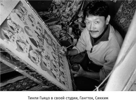 Мы сидели в его студии в Гангтоке, столице индийского штата Сикким, бывшего когда-то независимым гималайским королевством. Тинли работал скрестив ноги на коврике, а я наблюдал за ним, прислонившись к стене. Перед Тинли на деревянной раме была растянута древняя танка, которую он реставрировал по заказу сиккимской королевской семьи. Он измельчал в ступке привезенный из Тибета голубой полудрагоценный камень, чтобы подкрасить кусочек неба.