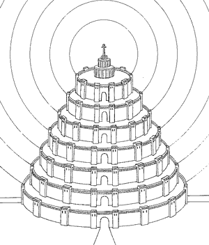 Отсюда можно пройти к следующему проходу между стенами, шага на три уже первого, с которого видна первая стена следующего круга с подобными же галереями вверху и внизу; а с внутренней стороны идет другая стена, опоясывающая палаты, с такими же выступами и переходами, опирающимися снизу на колонны; вверху же, там, где находятся двери в верхние покои, она расписана великолепною живописью. Таким образом, по подобным же кругам и через двойные стены, внутри которых находятся палаты с выступающими наружу галереями на колоннах, доходишь до самого последнего круга, идя все время по ровному месту; однако же при проходе сквозь двойные ворота (во внешних и внутренних стенах) приходится подниматься по ступеням, но устроенным так, что подъем почти не заметен: идешь по ним наискось, и высота лестниц поэтому едва ощутима. На вершине горы находится открытая и просторная площадь, посередине которой возвышается храм, воздвигнутый с изумительным искусством.